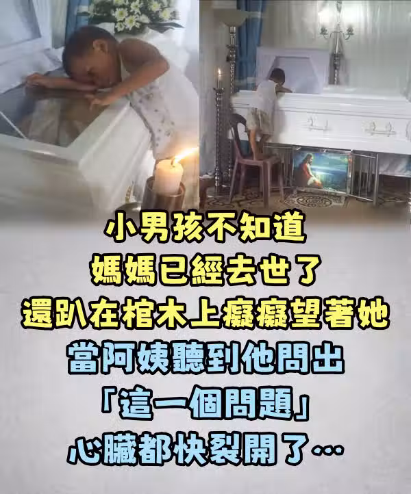 小男孩不知道媽媽已經去世,還趴在棺木上痴痴望著她,當阿姨聽到他問出「這一個問題」心臟都快裂開了