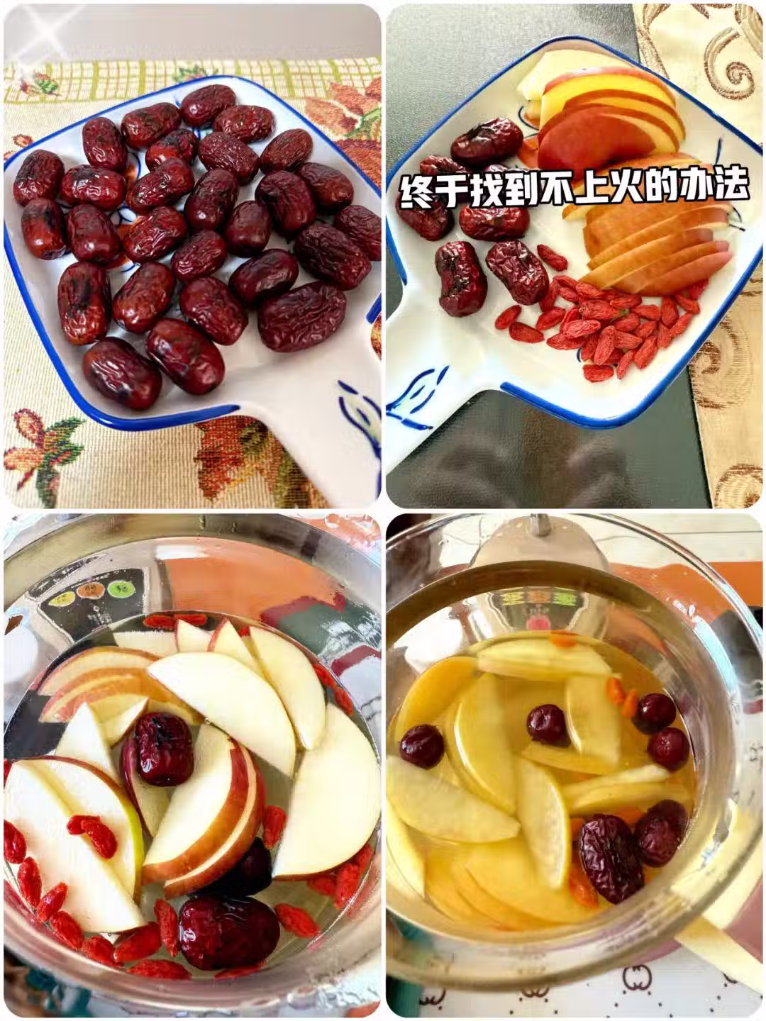 將蘋果🍎洗凈去核切片,焦棗、枸杞洗凈,一起放入養生壺中,加入適量清水,煮半個小時左右。