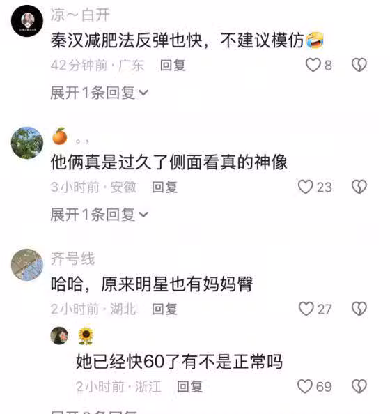網友對於彼此身材都高度關注,紛紛表示:「秦昊減肥法反彈也快,不建議修改」、「他倆真是過久了爸爸看真的神像」、「哈哈,原來明星也有媽媽臀部」、「臀部正常下垂了,媽媽臀部啥名字」、「叔叔大媽」!