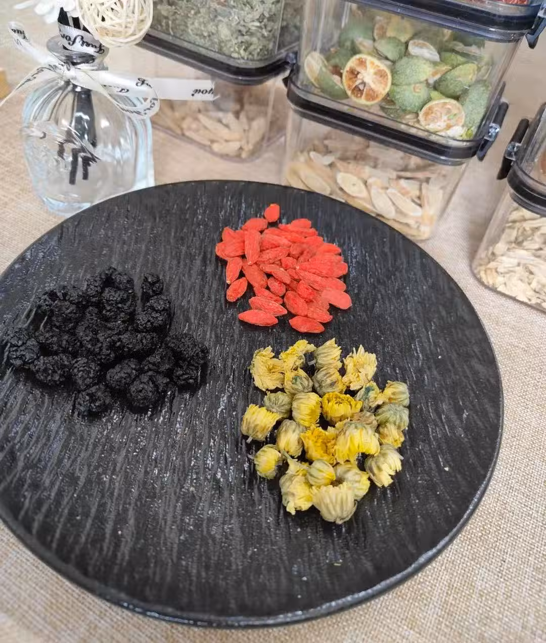 桑葚干15粒、枸杞20顆、胎菊10朵、冰糖3粒(加不加都行)