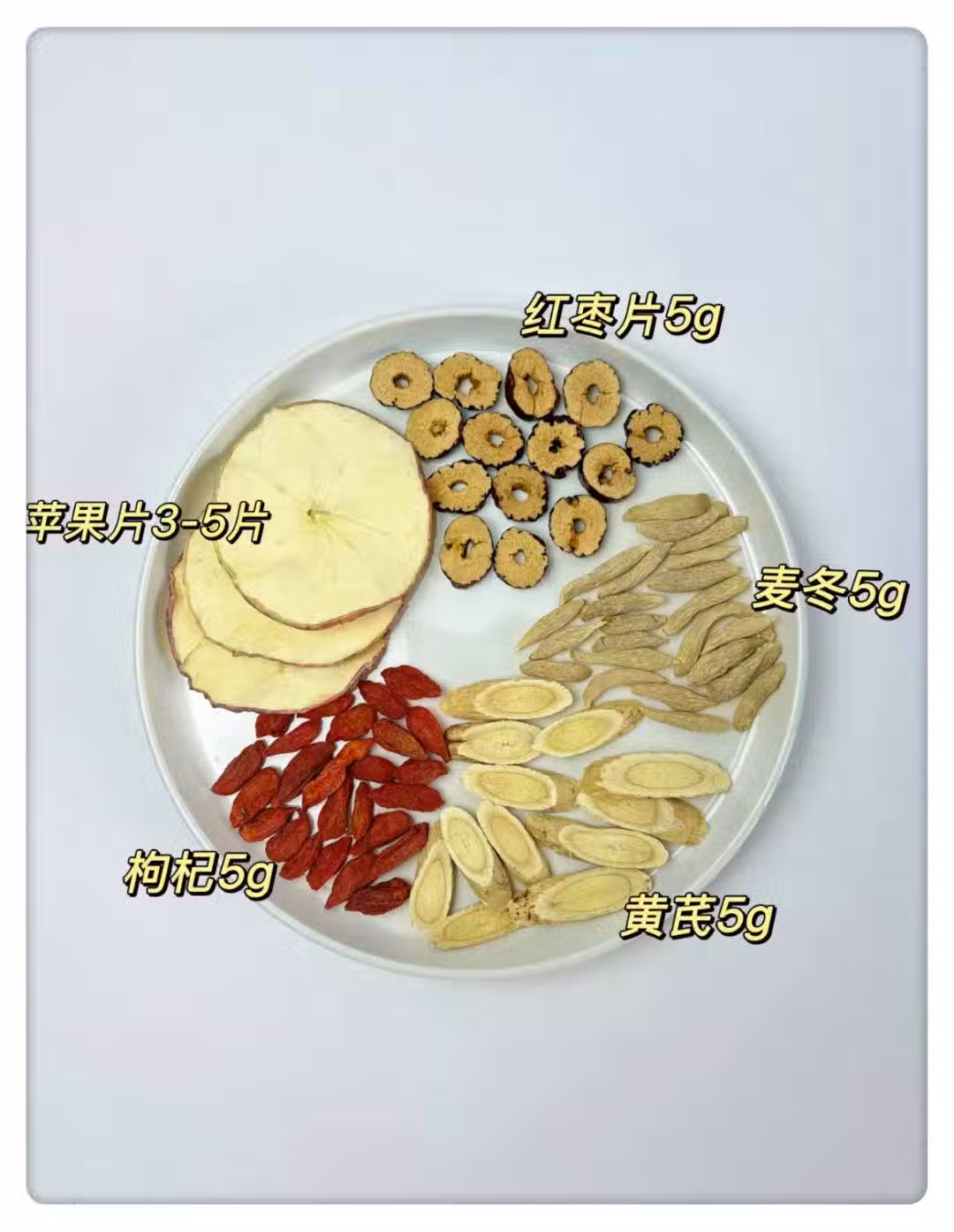 蘋果片3塊|黃芪6g|麥冬8顆|枸杞1小把|紅棗去核5g