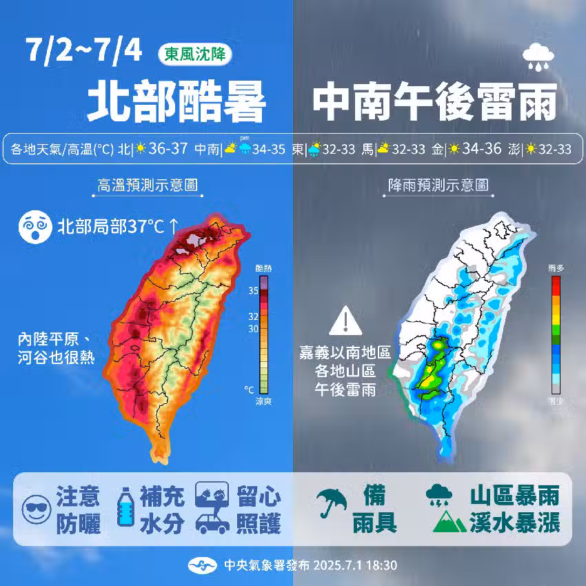 根據媒體《東森新聞》、《三立新聞網》的報導,中央氣象署指出,今 (2) 日台灣各地多為晴到多雲、高溫炎熱的好天氣,普遍高溫都能有32度以上,北部地區甚至有機會飆破37度,僅東半部及恆春半島不定時有零星短暫陣雨,午後嘉義以南地區及各山區有局部短暫雷陣雨。