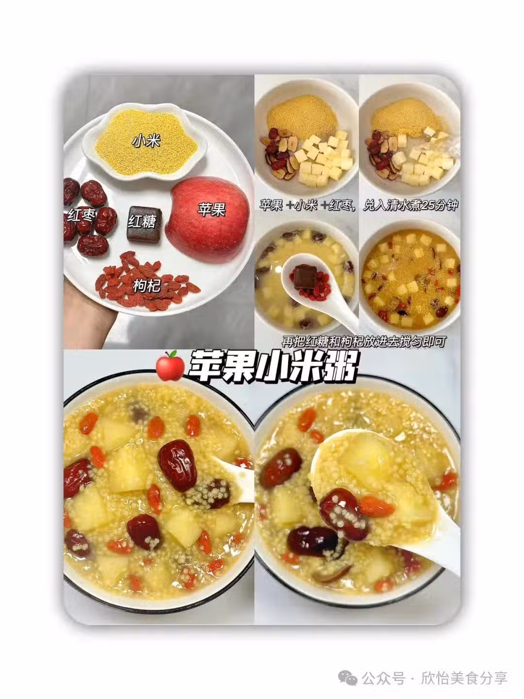 1、蘋果小米粥,準備食材蘋果,紅糖,小米,紅棗干,枸杞,備好食材後先把小米紅棗乾洗凈,蘋果去皮切成合適的小塊,小米紅棗加蘋果塊一起加入適量清水煮25分鐘,後在加入紅糖和枸杞再煮兩分鐘攪拌均勻即可出鍋,放涼後放入冰箱降溫風味更佳!