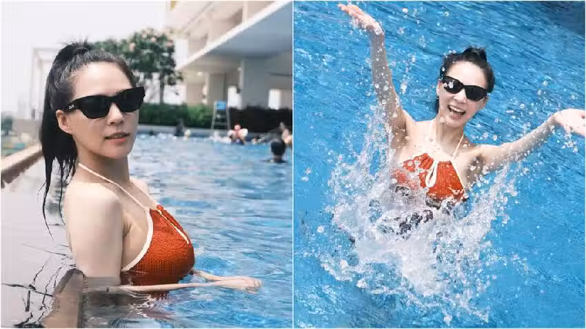 下身搭配一件白色三角泳褲,外罩的蕾絲布料透明度大開,極致逆天美腿絲毫不見任何贅肉,連她本人也在貼文中感嘆:「當寫真女星變成寫真媽咪」。