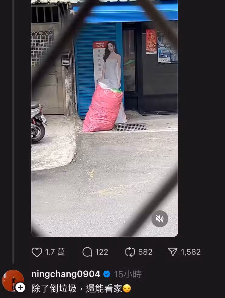 有網友在Threads發文分享一段趣味影片,打趣說:「剛剛想說怎麼有人一早出來等垃圾車,原來是張鈞甯啊。」影片中張鈞甯的人形立牌被放在一戶家門口,前面還放著一大包垃圾準備要丟掉;結果,本尊竟然跳出來幽默回應:「除了倒垃圾,還能看家。」