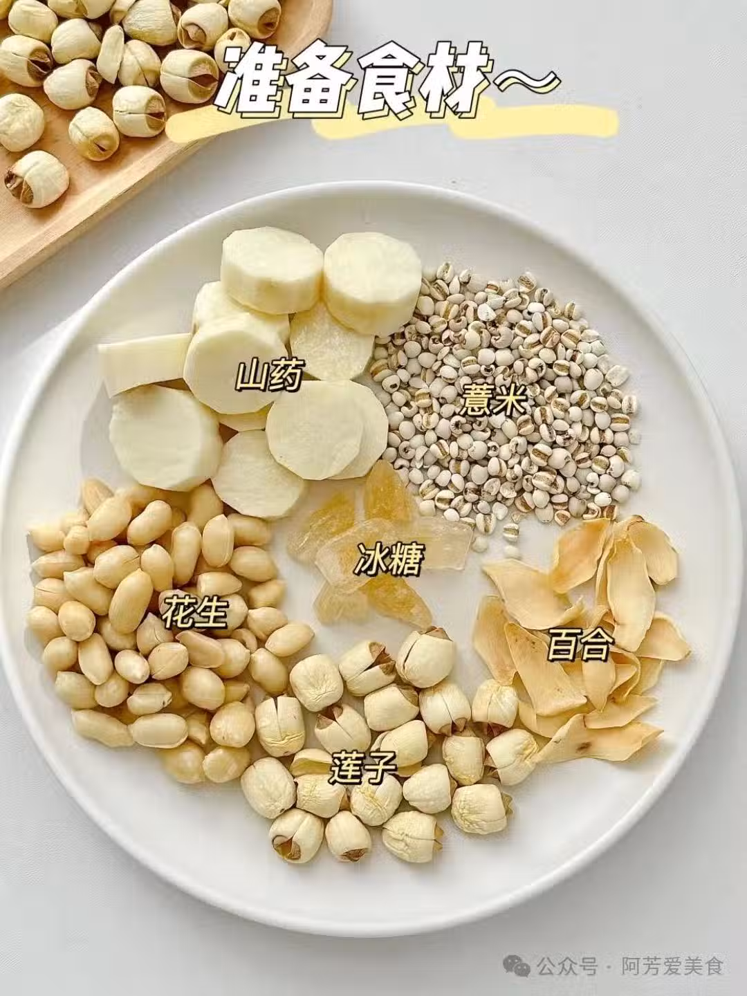 泡好的薏米、蓮子、花生放進鍋,加足量清水先煮開。接著放山藥塊和百合瓣,蓋上蓋子,小火慢燉了快半個鐘頭。廚房裡開始飄出穀物混合著百合的淡香。