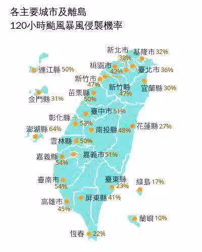 根據氣象署預測,各主要城市及離島120小時颱風暴風侵襲機率,多數地區都在50%以下,僅中南部的部分地區高於50%,澎湖縣目前為64%