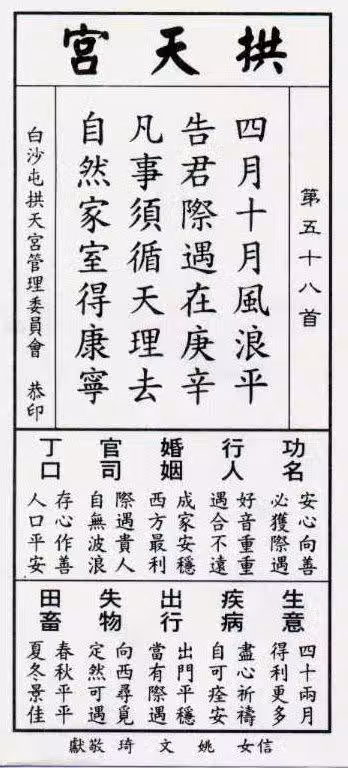 凌製作說明,籤詩中提到四月、十月分別代表夏季與冬季,這兩段時間台灣都順遂平安,而災難預言日期國曆7月5日為農曆6月11日也屬於夏季,「媽祖意思是平安、無事」,而第2句「告君際遇在庚辛」,媽祖指的是秋天將有好事情發生,屆時大家可以拭目以待。針對「凡事須循天理去,自然家事得康寧」,凌製作說,媽祖意思是凡事都能夠依照天理而行,自然就可以免除掉一些不必要的人禍與天災。