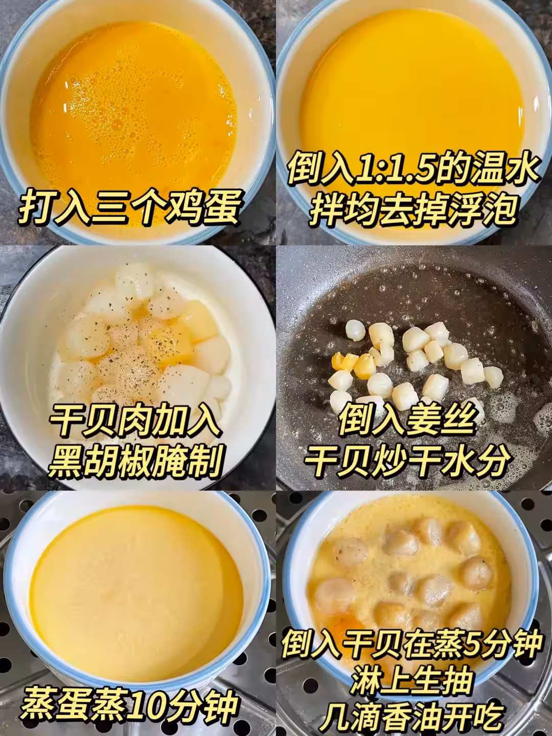 5️⃣、乾貝鋪在上面,再蒸五分鐘,最後淋點生抽和香油就完成了。