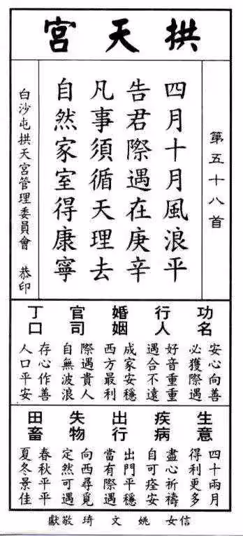 凌製作說明,籤詩中提到四月、十月分別代表夏季與冬季,這兩段時間台灣都順遂平安,而災難預言日期國曆7月5日為農曆6月11日也屬於夏季,「媽祖意思是平安、無事」,而第2句「告君際遇在庚辛」,媽祖指的是秋天將有好事情發生,屆時大家可以拭目以待。