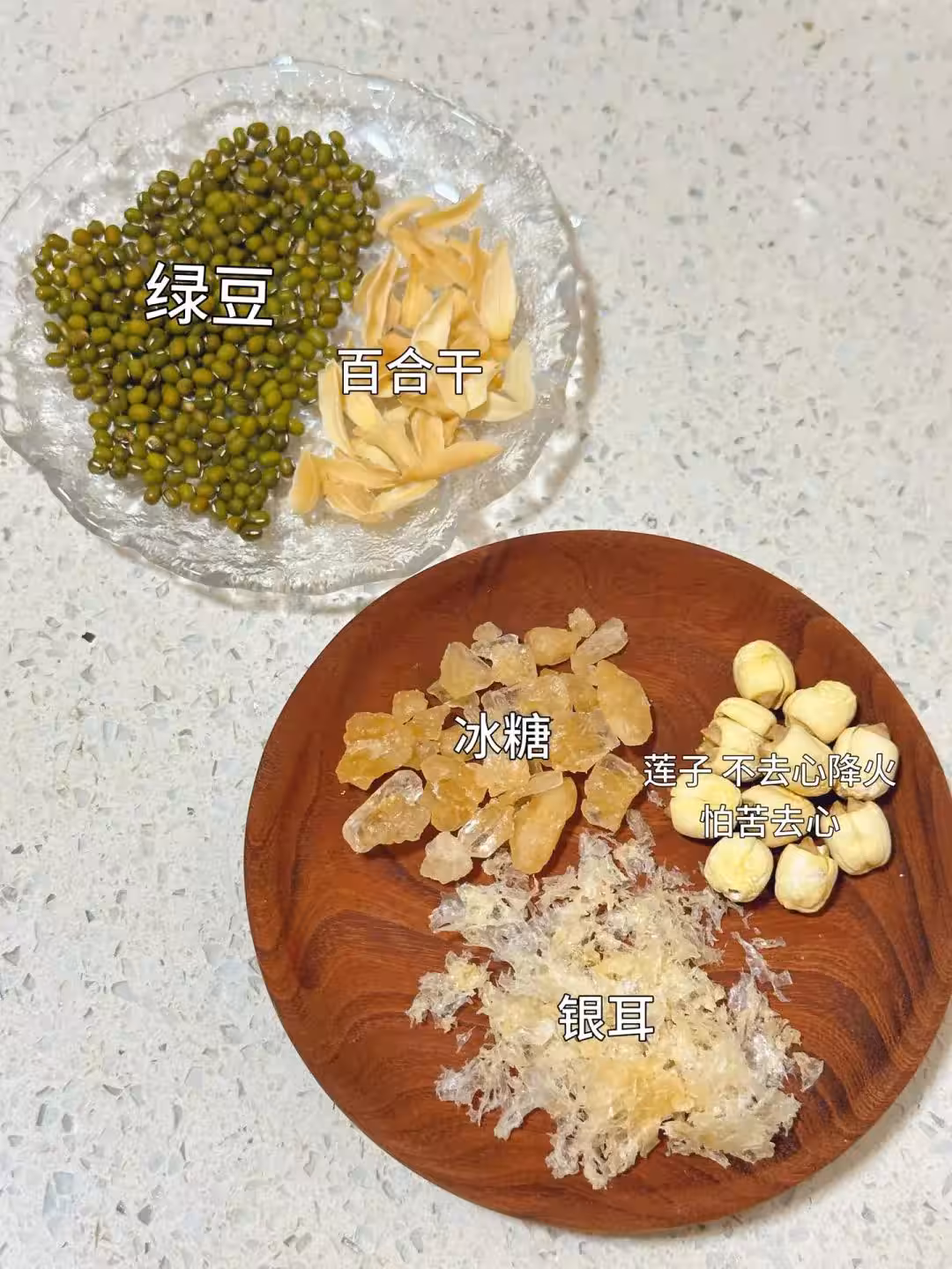 1. 泡發食材:綠豆提前2小時浸泡;銀耳用溫水泡發後撕成小朵,蓮子、百合洗凈泡10分鐘(若蓮子帶芯可去芯,避免苦澀)。