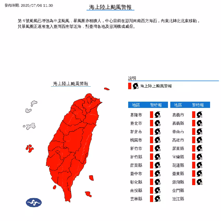 西南部海域已觀測到4米浪高,颱風中心附近更可能出現7米巨浪,受颱風環流影響,旺盛對流雲係為花東及恆春帶來較大雨勢,預估今晚到明早颱風中心通過澎湖,中部以北雨勢會更加明顯!