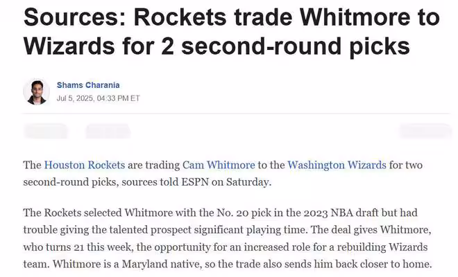 1換2交易達成,火箭調整14+2豪陣!休城3大理由割愛白魔仁至義盡