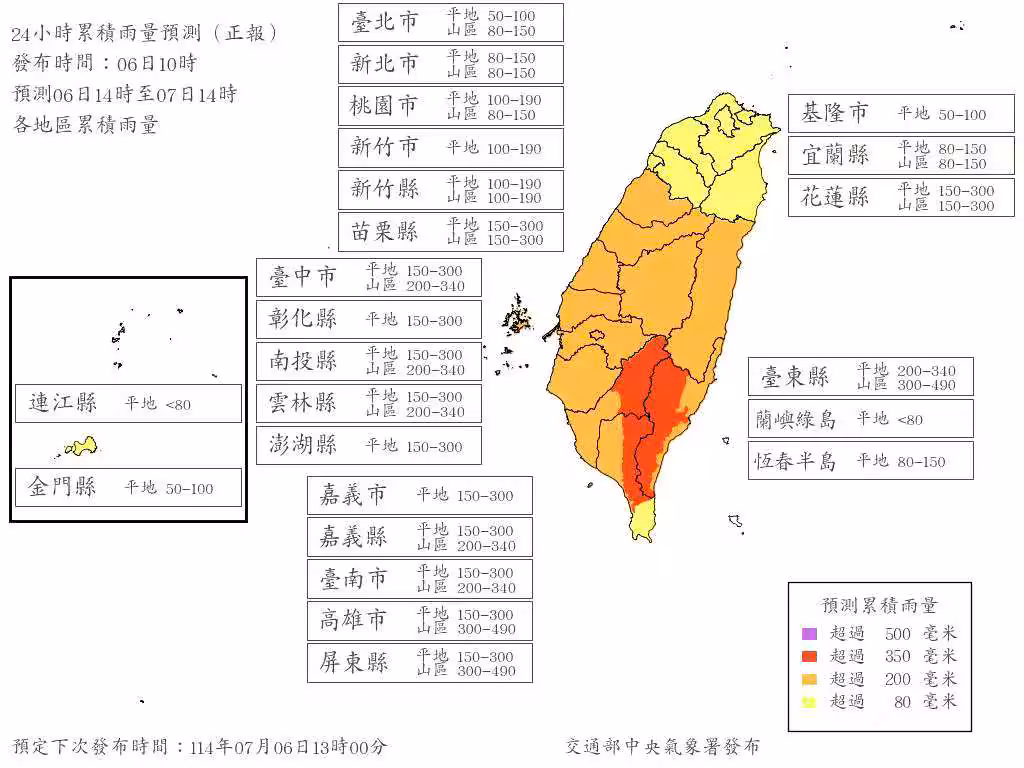 而停班停課雨量標準為不分山區或平地350毫米的則包括有基隆市、台北市、新北市、新竹市、彰化縣、嘉義市、台南市及離島。