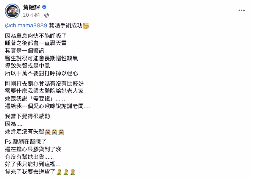 恐失智、中風!黃鐙輝岳母「昏昏沉沉就醫」緊急開刀 揭病因「驚人畫面曝光」:警訊常被忽略