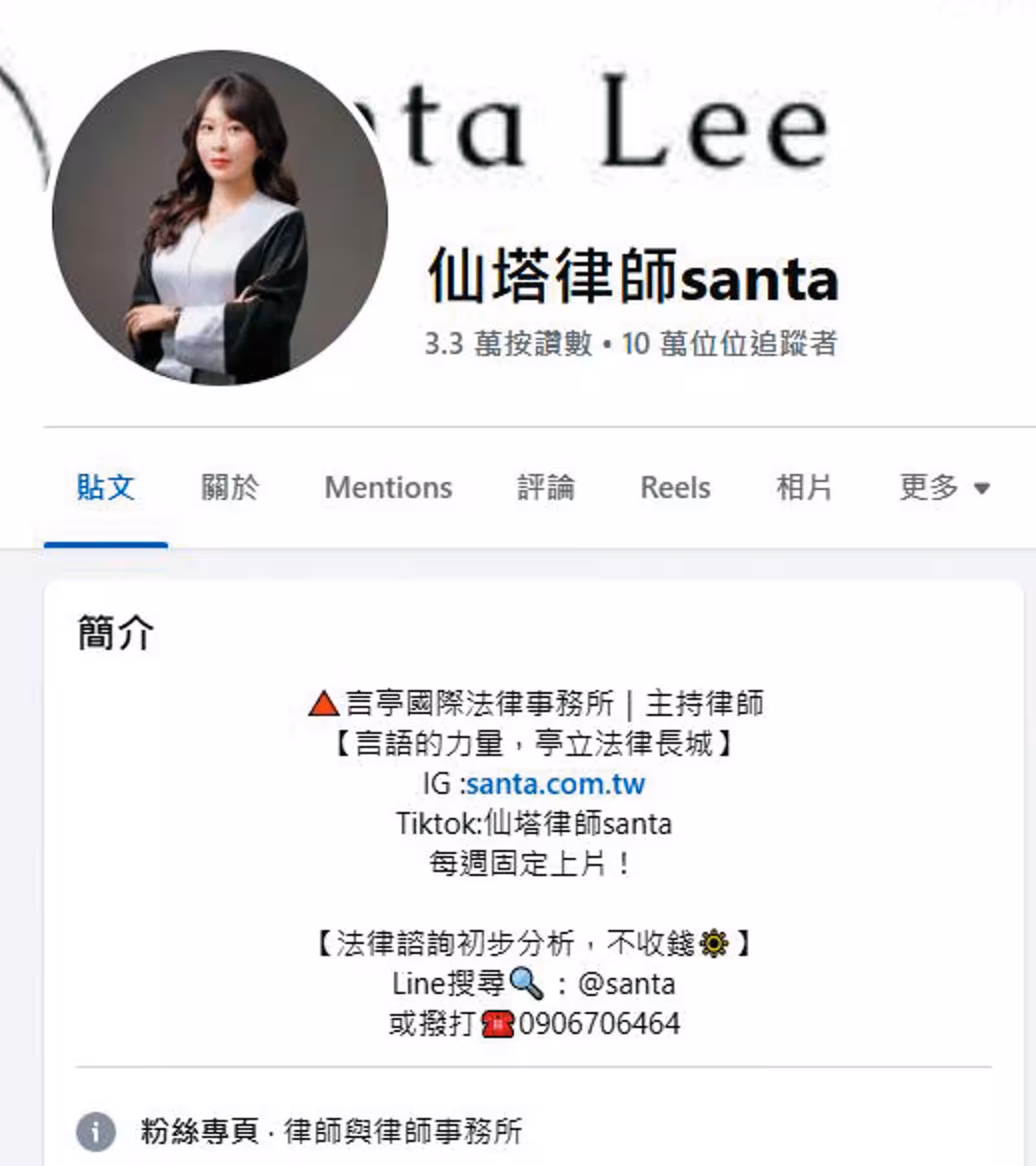 ▲仙塔律師擅長經營社群,在IG有22萬人追蹤,FB也有3.3萬粉絲。(翻攝自仙塔律師santa 臉書)