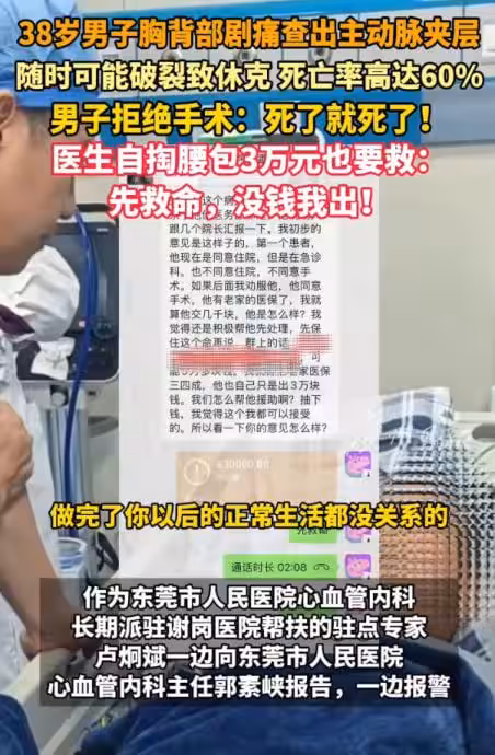 (東莞訊)38歲的廠工因胸背劇痛就醫,被查出主動脈夾層的危重情況,但他卻因經濟問題而拒絕住立即手術和住院,執意欲拖著病軀回老家。