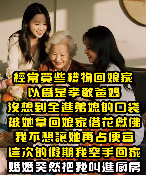 經常買禮物回娘家!以為是孝敬爸媽「沒想到全進弟媳的口袋」被她拿回娘家借花獻佛, 我不想讓她再占便宜,這次假期「我空手回家」媽媽突然把我叫進廚房…