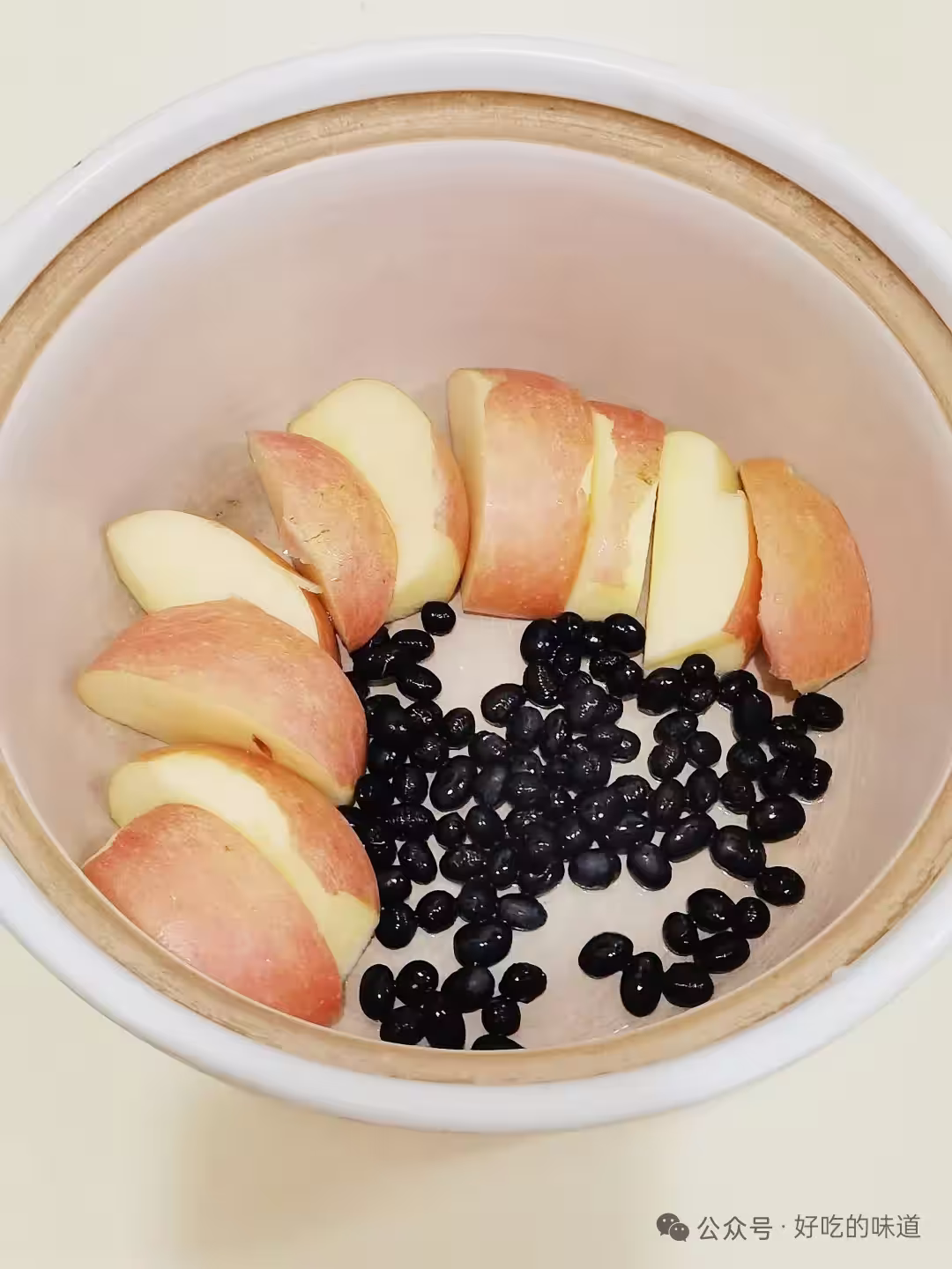 黑豆提前浸泡2小時,蘋果切塊,加清水煮30分鐘至黑豆軟爛。湯色清亮,味道清甜,孩子喝完小臉水潤潤!