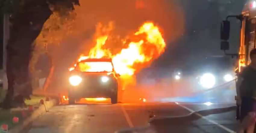 據了解,消防局獲報後,隨即派前人車趕抵救援,整台車全面燃燒,冒出熊熊火光及濃煙,消防員緊急洒水灌救,將火勢撲滅,現場無人受困傷亡。