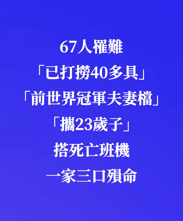 67人罹難「已打撈40多具」!「前世界冠軍夫妻檔」攜23歲子搭死亡班機 一家三口殞命