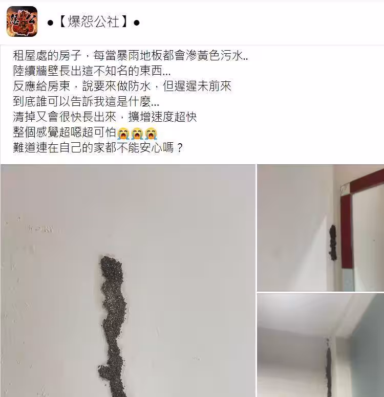 根據《三立新聞》報導,一名女網友在臉書社團「爆怨公社」上崩潰求助,透露每當暴雨來襲時,租屋處的地板都會滲出黃色污水,近期梅雨季到更是避不過,不料,最近牆壁還接連冒出詭異的「黑色條狀物體」,不論她怎麼清掉還是會長出來,更可怕的是,再次長出來後,擴增速度比之前還快,無奈發問:「到底誰可以告訴我這是什麼…」