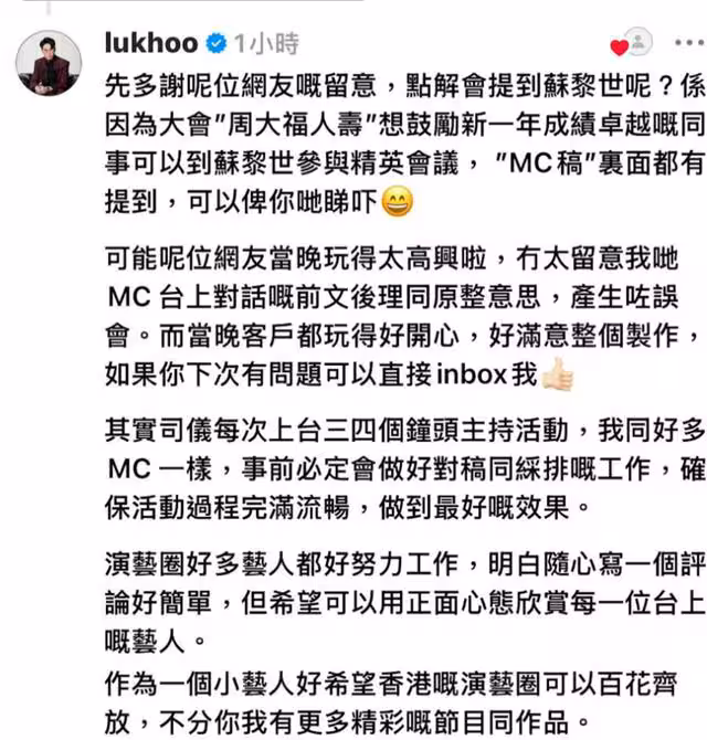 至於是否有客戶提醒他注意言辭,陸浩明稱自己只是「跟稿讀」,並表示觀眾的喜好因人而異他還提到,香港經濟不景氣導致工作量減少,酬金也比疫情前低了兩三成,但自己「咩價錢都得(什麼價格都可以)」。