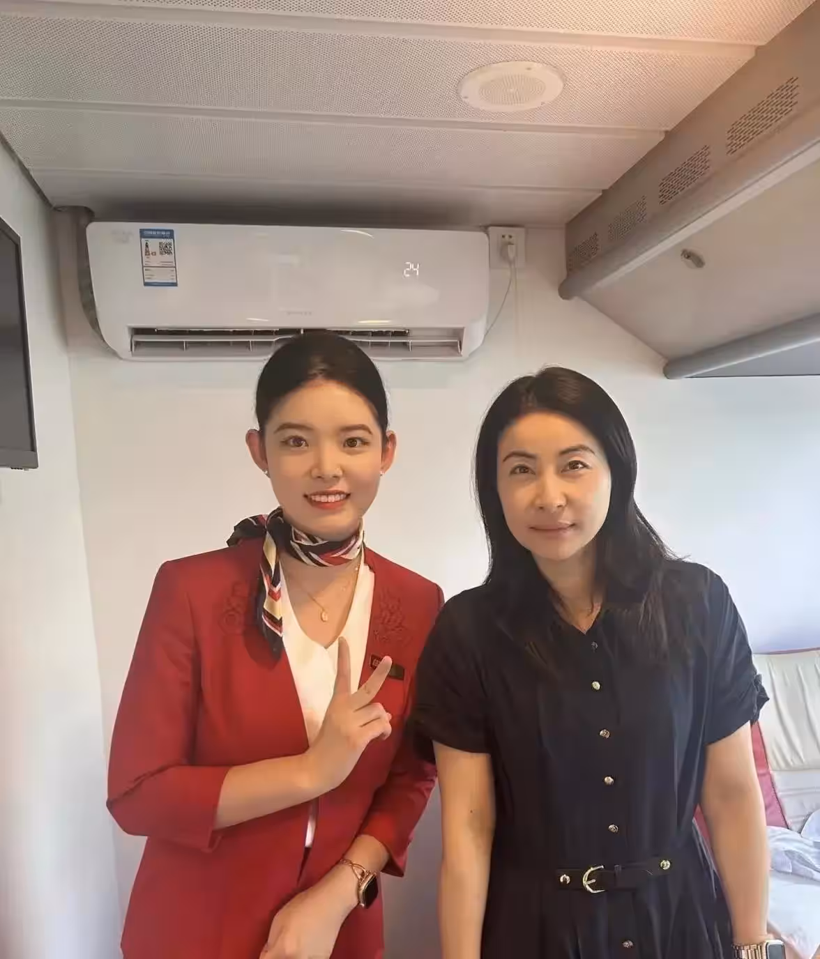 43歲郭晶晶坐商務艙出行,和空姐一起合照,臉部素顏狀態非常好