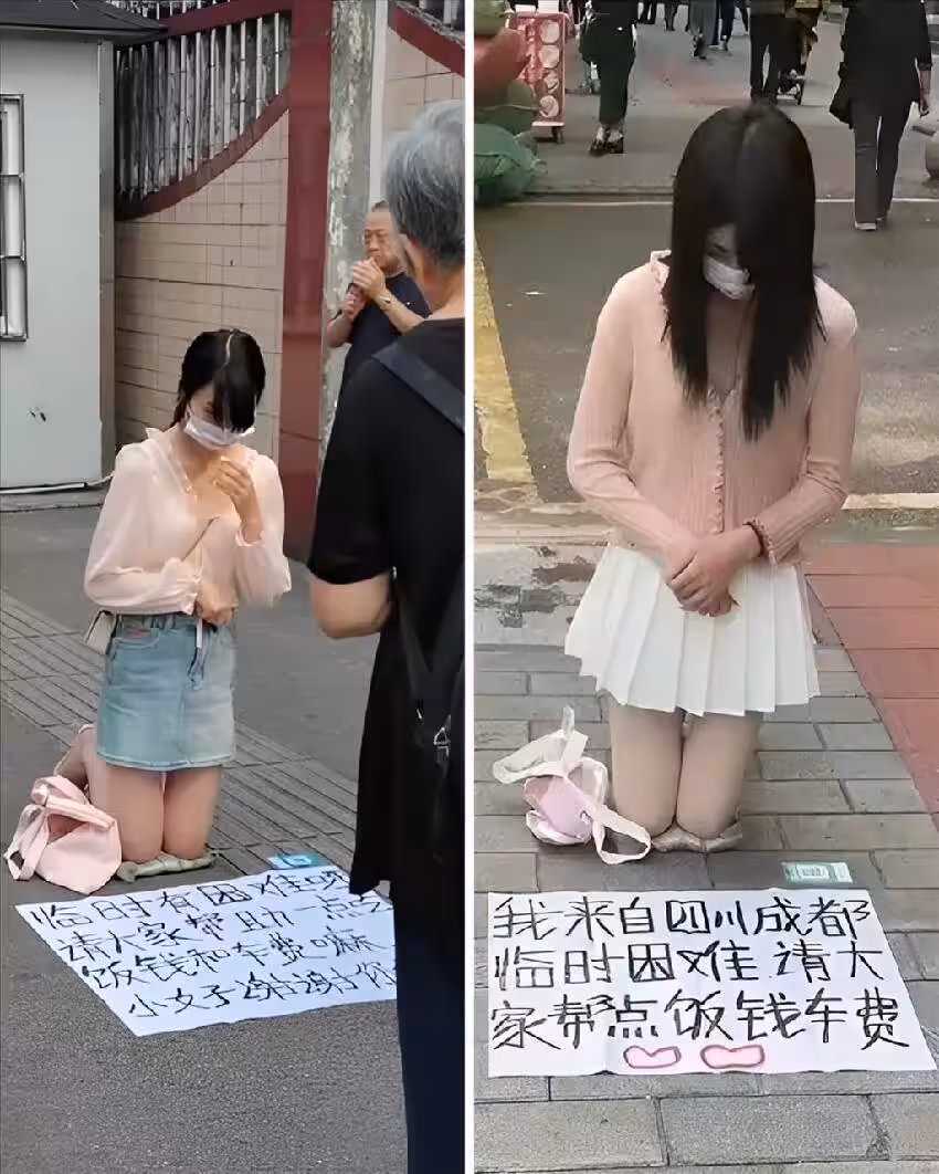 然而日前在四川卻出現了一位年輕女孩跪地乞討,由於她穿著時尚乾淨,因此也讓大家困惑為何她做出這樣的舉動...