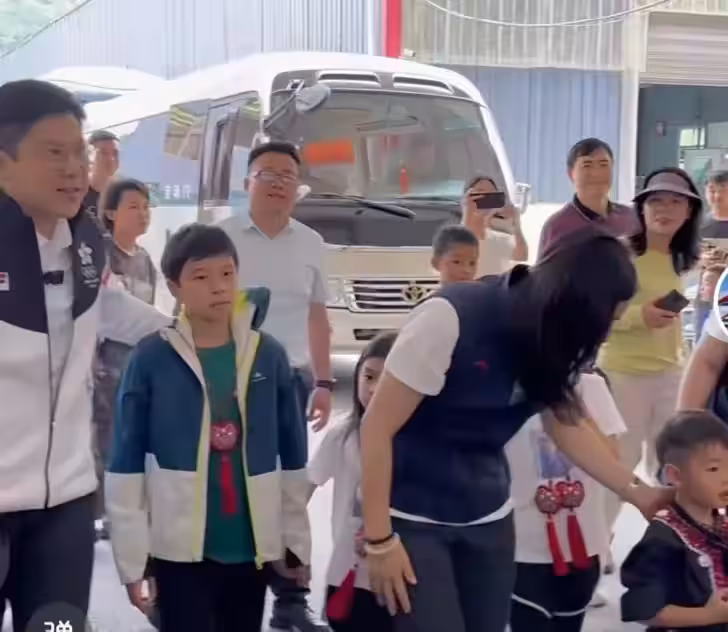 郭晶晶一家五口在貴州,俯身握手一點沒架子,衣服logo顯愛國情懷