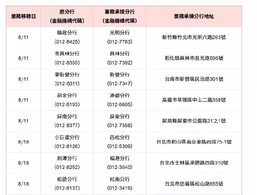 北富銀也宣告,10間分行暫停營業,縣政分行、南員林分行、東新營分行、前金分行、屏南分行,自8月11日起移轉鄰近分行服務;小巨蛋分行、劍潭分行、松德分行、金城分行、光復分行,自8月18日起,移轉由鄰近分行提供服務。