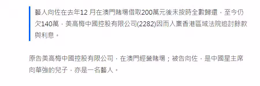 據港媒報道稱,原告美高梅中國控股有限公司在澳門經營賭場業務,被告向佐為中國星集團主席向華強之子,同時具有藝人身份。