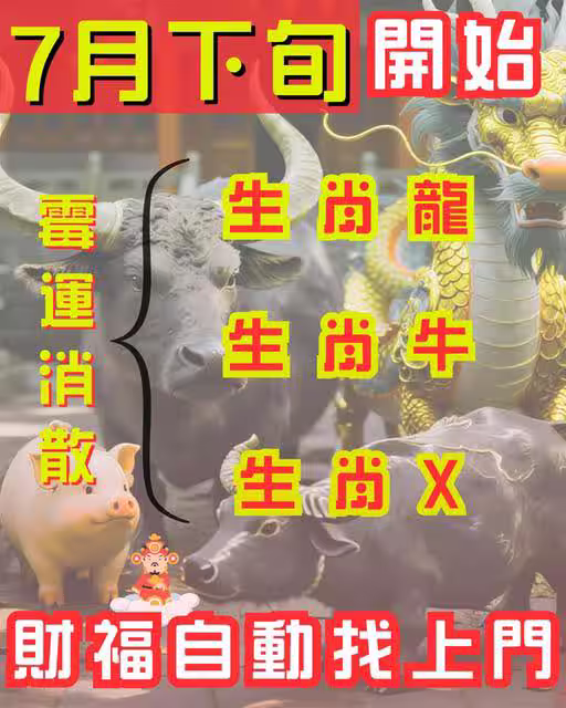 在神秘的生肖運勢輪轉中,7月下旬宛如一道曙光,為部分生肖帶來了命運的轉折。 生肖牛、生肖龍以及生肖豬,在這段時間裡,將告別往昔的陰霾,迎來運勢的高光時刻,可謂苦日子熬到頭,霉運統統被趕走,生活中添財又添福。