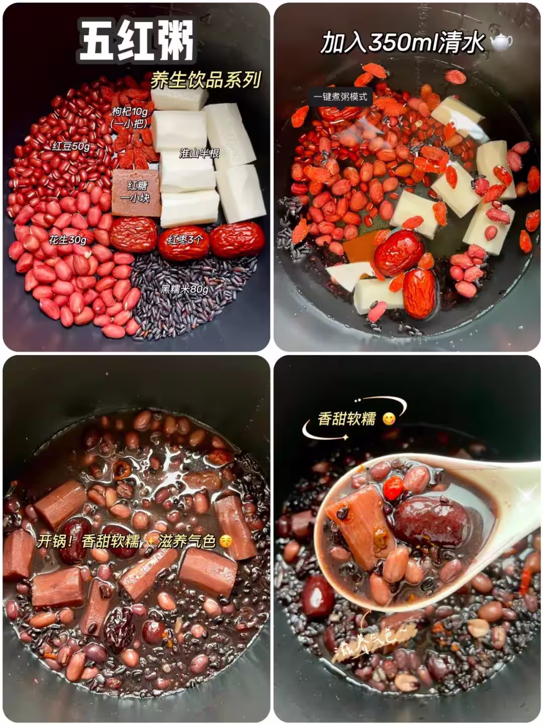 淮山半根 ➕ 紅棗3顆 ➕ 黑糯米80g ➕ 花生30g ➕ 紅豆50g ➕ 枸杞10g(一小把)➕ 紅糖一小塊