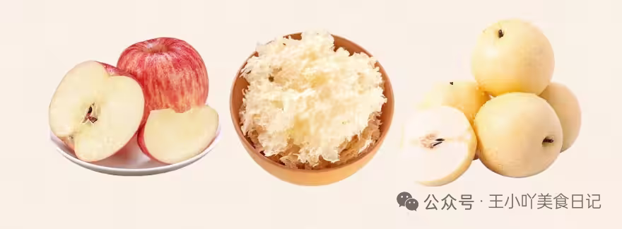 【做法】:銀耳泡發撕小朵,蘋果、雪梨切塊,加水煮 30 分鐘,可加少許冰糖。