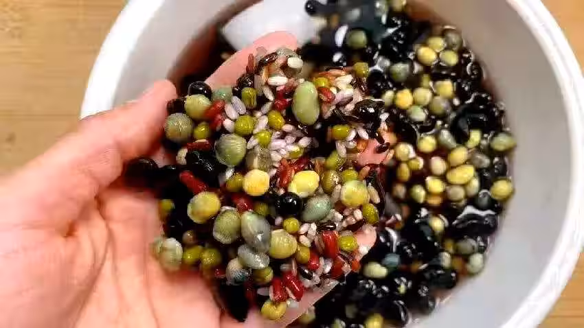 然後再用乾淨的清水多衝洗幾遍,最後再用清水浸泡半個小時,浸泡可以把所有的豆類外殼泡軟,在煮粥的時候能夠很快的煮熟,煮出來特別的粘稠。