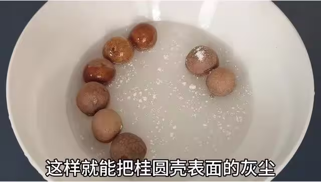 這是因為桂圓殼當中也含有膳食纖維,多酚類物質,以及少量礦物元素等等,雖然說它不能直接當做食材來食用,但是也有藥用價值哦,因此在這裡不建議扔掉,直到用麵粉把桂圓清洗乾淨,這時候我們可以再次用一勺水把它沖一衝,衝去表面殘留的灰塵和麵粉就可以了。