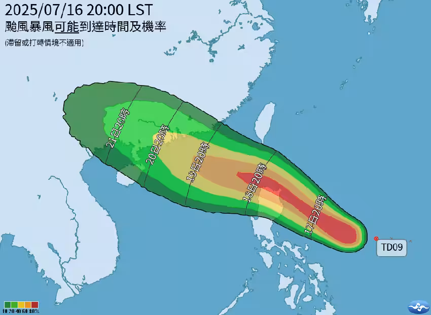19日颱風進入南海後,台灣持續受其外圍環流影響,東南部降雨情形持續,南部地區下半天也可能出現陣雨。20日颱風將漸往港澳南方海域移動,但台灣仍會受到其外圍環流東南風影響。