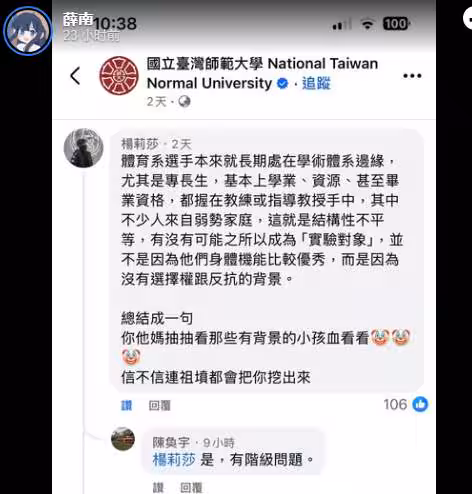 對此,就有一名網友曾在台師大官方臉書貼文下留言,寫道:「體育系選手本來就長期處在學術體系邊緣,尤其是專長生,基本上學業、資源、甚至畢業資格,都握在教練或指導教授手中。」該網友更點出,這些體育生有不少人來自弱勢家庭,也就是結構性不平等,並質疑:「有沒有可能之所以會成為『實驗對象』,並不是因為他們身體機能優秀,而是因為沒有選擇權跟反抗的背景。」最後,該網友更憤怒表示:「你他X抽抽看那些有背景的小孩血看看,信不信連祖墳都會把你挖出來。」