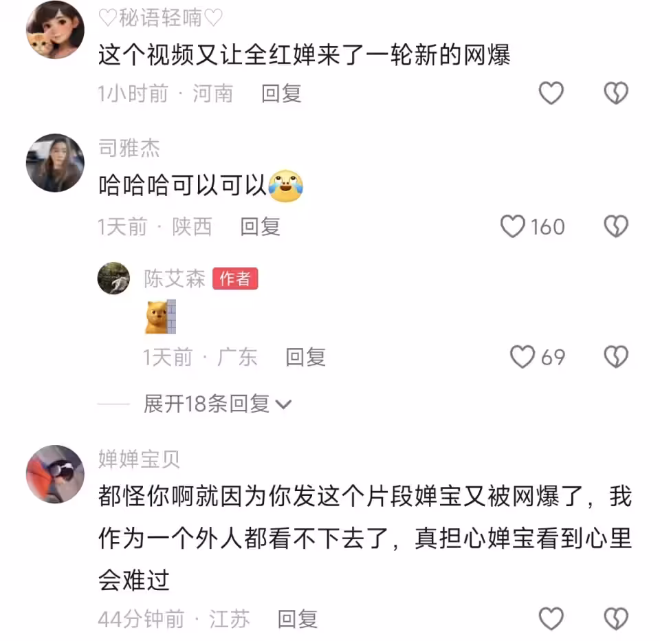 此外,也有網友將矛頭指向陳艾森,紛紛表示:「因為這個訓練片段 全紅嬋又被集體網暴了,大家都認為她一個動作都做不起來了」,「這個視頻又讓全紅嬋來了一輪新的網暴」,「都怪你啊,就因為你發這個片段嬋寶又被網暴了,我作為一個外人都看不下去了,真擔心嬋寶看到心裡會難過。」