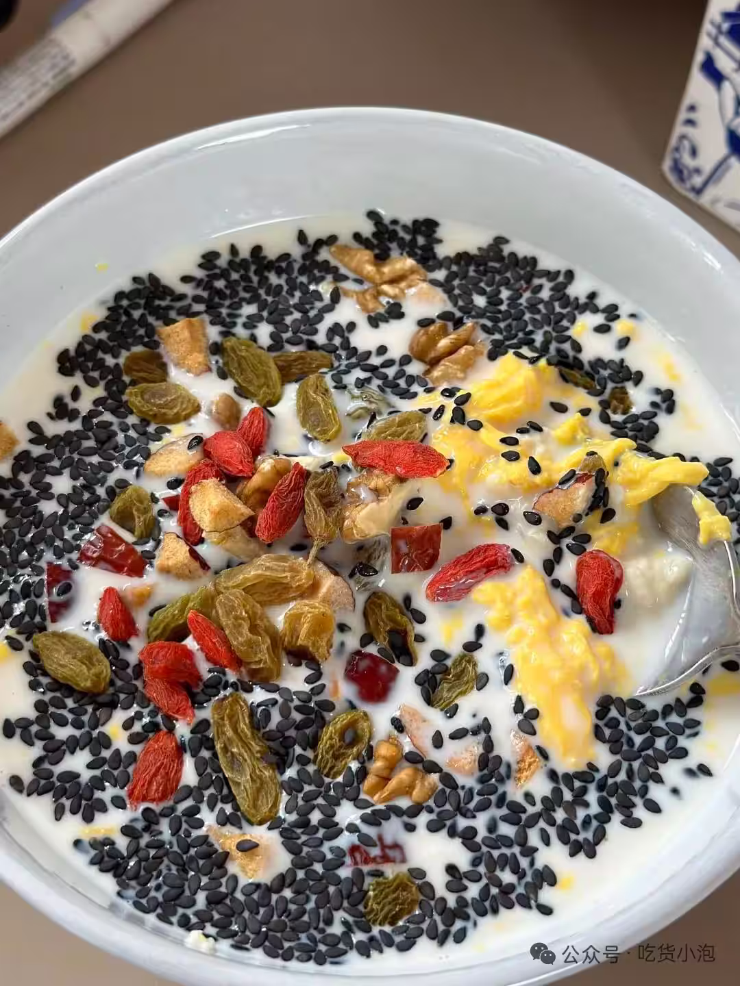 先將雞蛋提前打散。把牛奶倒入鍋中,放入枸杞,用中小火持續攪拌,直至煮沸。煮沸後轉小火,立刻倒入蛋液,倒入後先別急著攪拌,讓蛋液稍微凝固一下,大約8秒後快速攪拌,隨後關火,將其倒入碗中。接著放入醪糟及其他小料,最後用玫瑰花瓣進行點綴。
