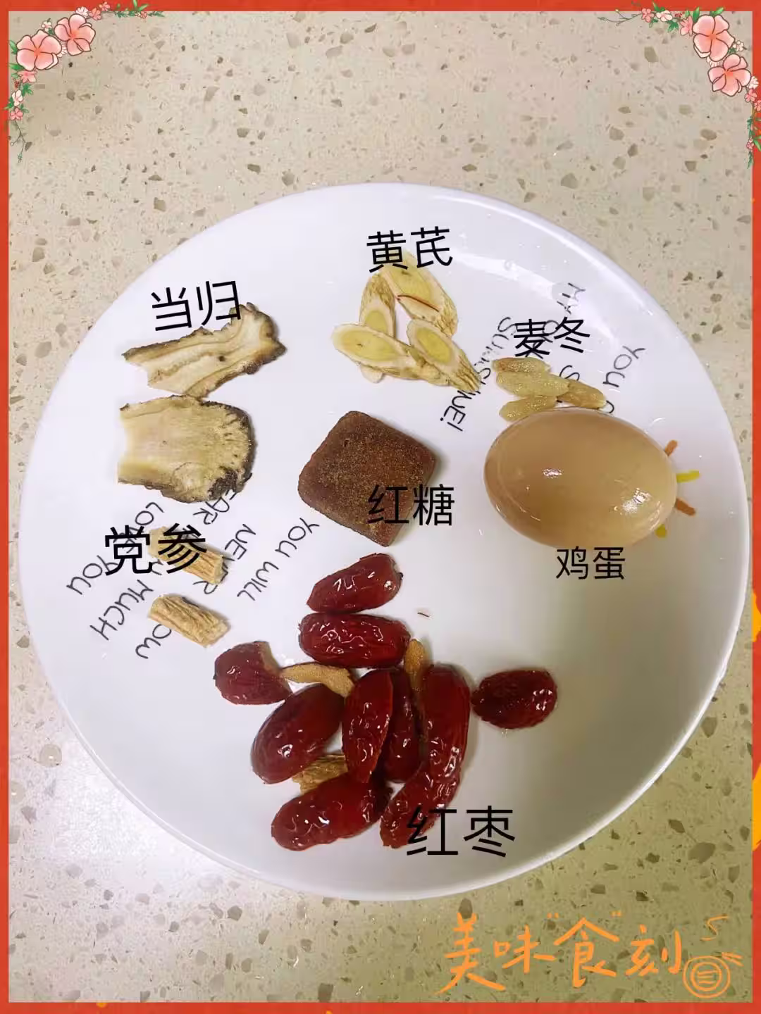 當歸(5克左右)+黃芪(10克左右)+黨參(8克左右)+紅棗(3-5顆)+雞蛋(1個)