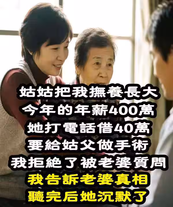 姑姑把我撫養長大!今年薪400萬「她打電話借40萬」給姑父做手術 我拒絕了被老婆質問「我告訴老婆真相」聽完後她沉默了...