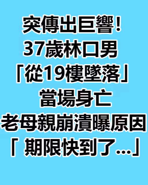 根據《ETtoday新聞雲》報導,新北市林口區發生一起令人心痛的墜樓事件,一名37歲男子從住處19樓墜下身亡,最令人不舍的是,母親直到事發18小時後才得知噩耗。
