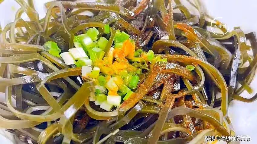 第三步:將生抽、陳醋、雞精、辣椒油、十三香、食鹽、香油、蔥花全部放入到海帶中攪拌均勻,然後腌制15分鐘,這樣能使海帶絲更入味。