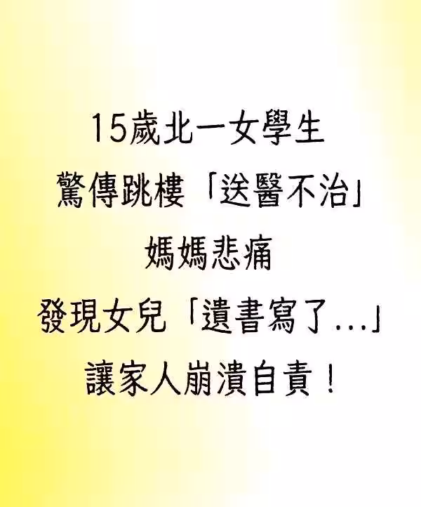 快訊/15歲北一女學生驚傳跳樓「送醫不治」!媽媽悲痛發現女兒「遺書寫了...」讓家人崩潰自責!