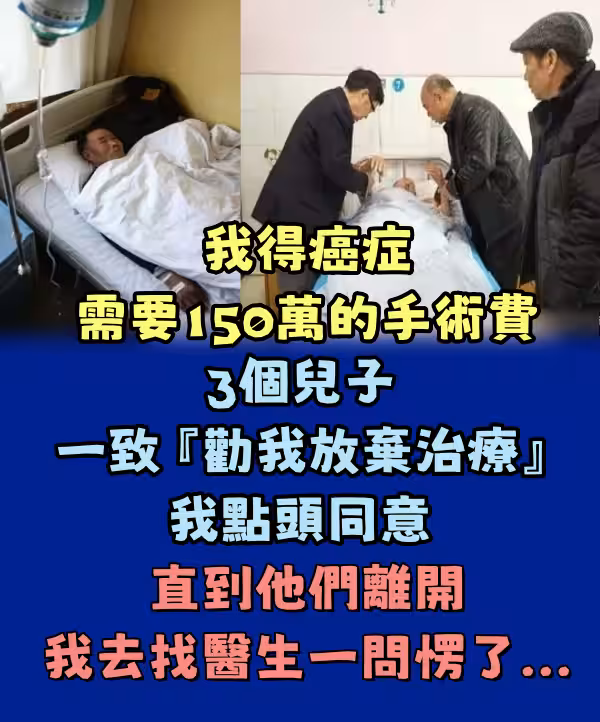 我得癌症需要150萬的手術費 3個兒子一致『勸我放棄治療』我點頭同意 直到他們離開我去找醫生一問愣了....