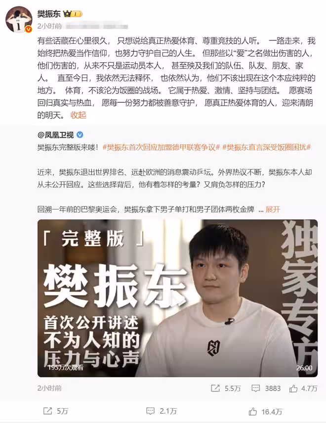 成也飯圈敗也飯圈,樊振東碾壓王楚欽擊敗林詩棟奪冠,仍重返德國