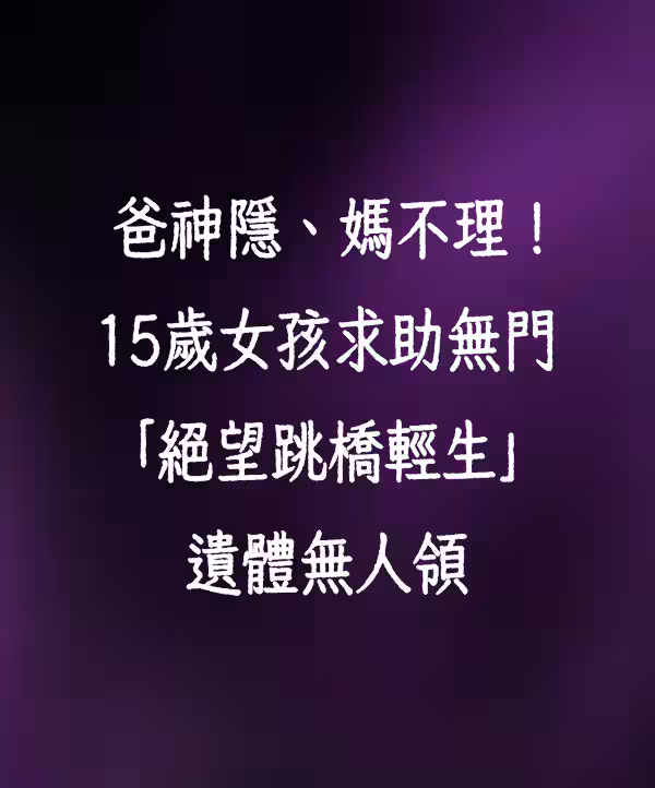 快訊/爸神隱、媽不理!15歲女求助無門「絕望跳橋輕生」 遺體無人領.