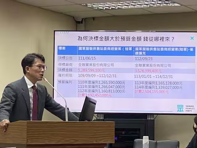 黃國昌質疑,國軍服裝供售站委商契約,陸軍部分目前執行得標的是全聯,但全聯有做衣服嗎?顧立雄回應,這個部分是供售站部分。黃國昌表示,那個不是只有供售站,而是國防部的地,在國防部旁邊,你們提供房子讓他們賣衣服。